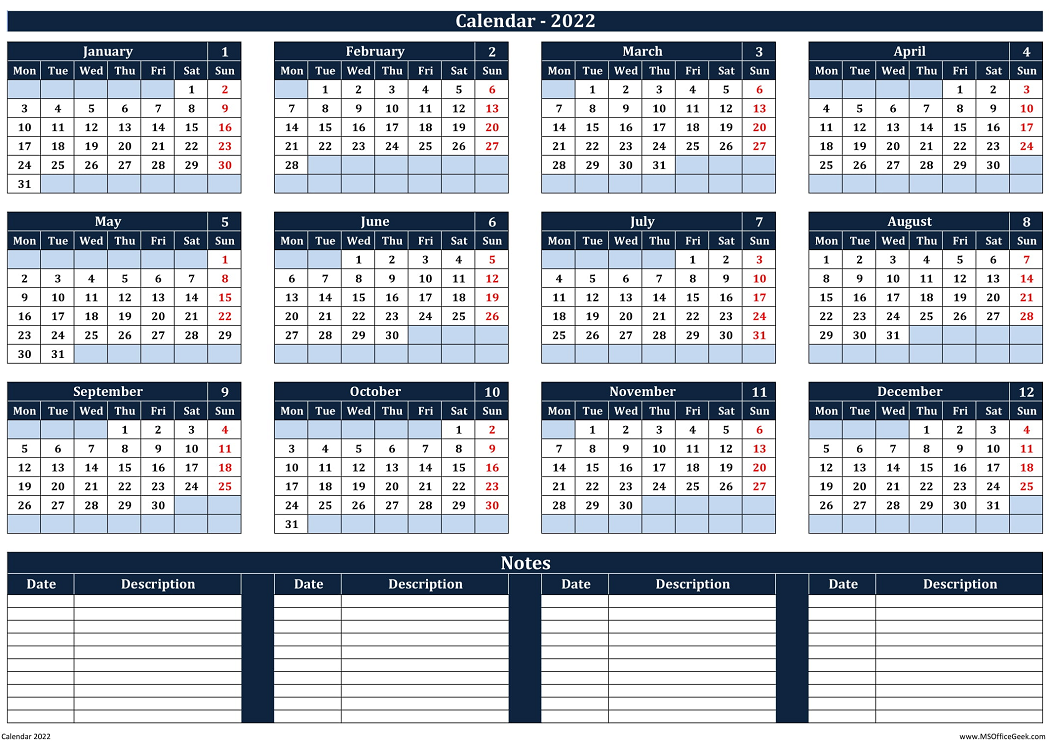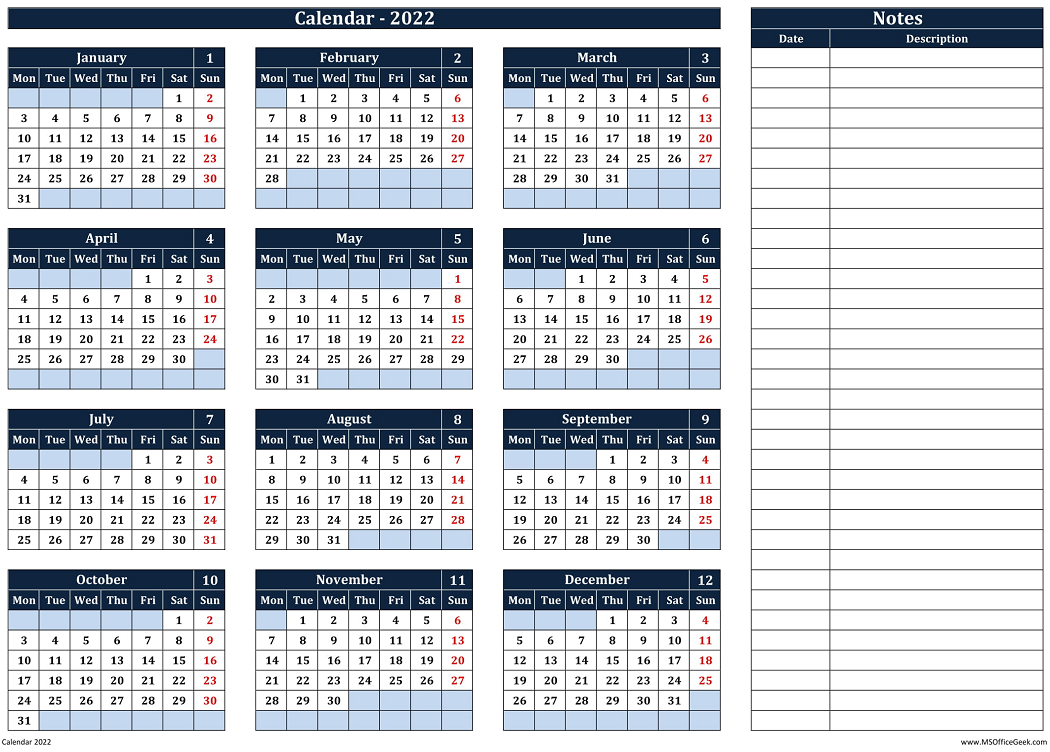 Moreover, you can download Calendar 2022 Monday Start with Notes in Landscape and Portrait format from the link below: