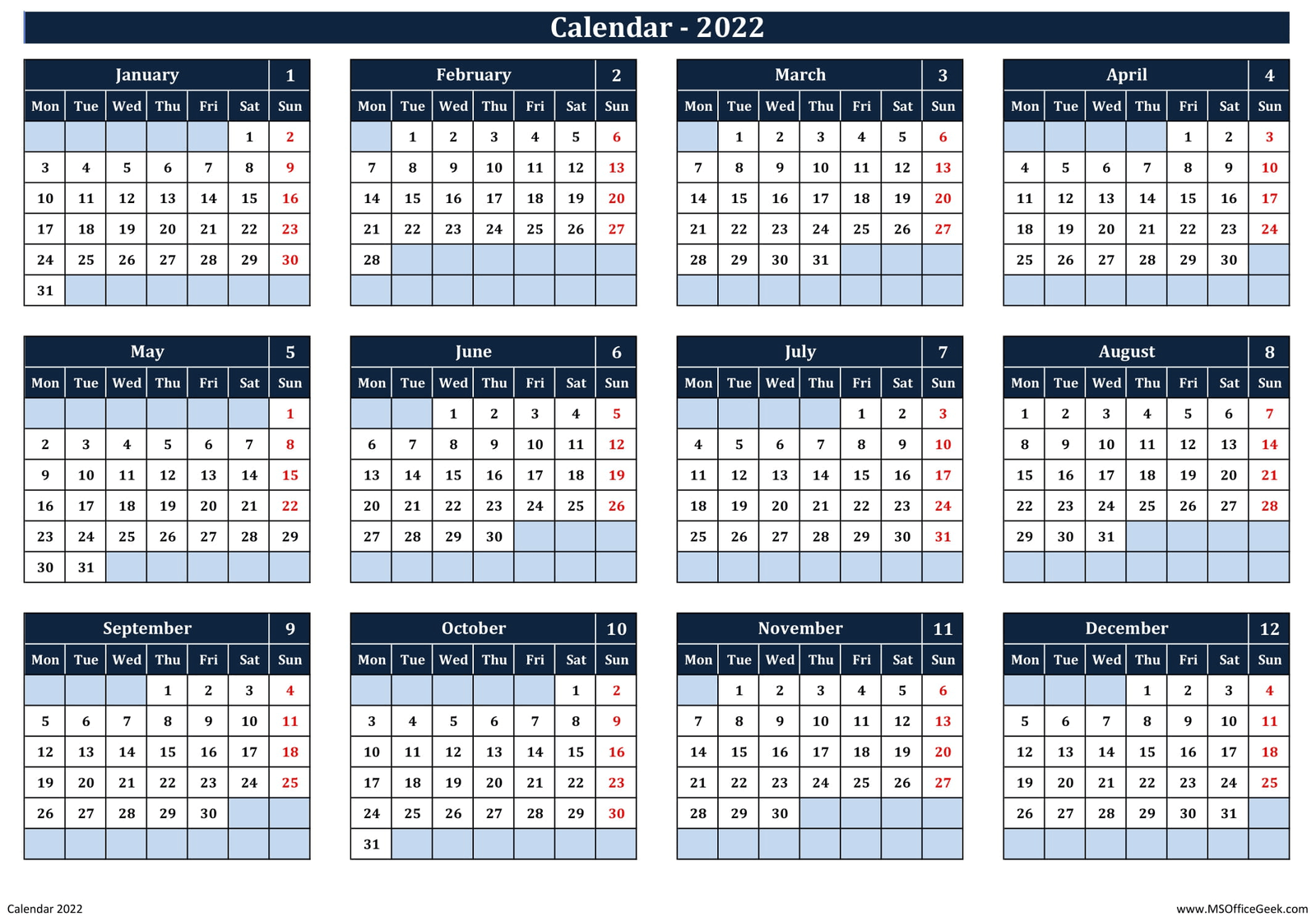 Additionally, you can download Calendar 2022 Monday Start without Holidays in landscape and portrait format from the link below: