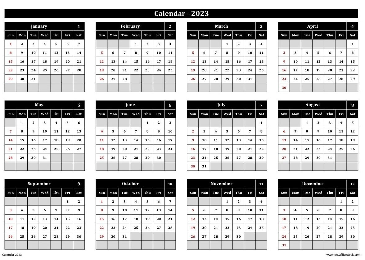 Download Printable Colorless Calendar 2023 Landscape. Gregorian 12-month Calendar with Sunday as the first day of the week. This template is best for offices, homes, or walls. As it is colorless, it uses less ink to print and is cost-effective.